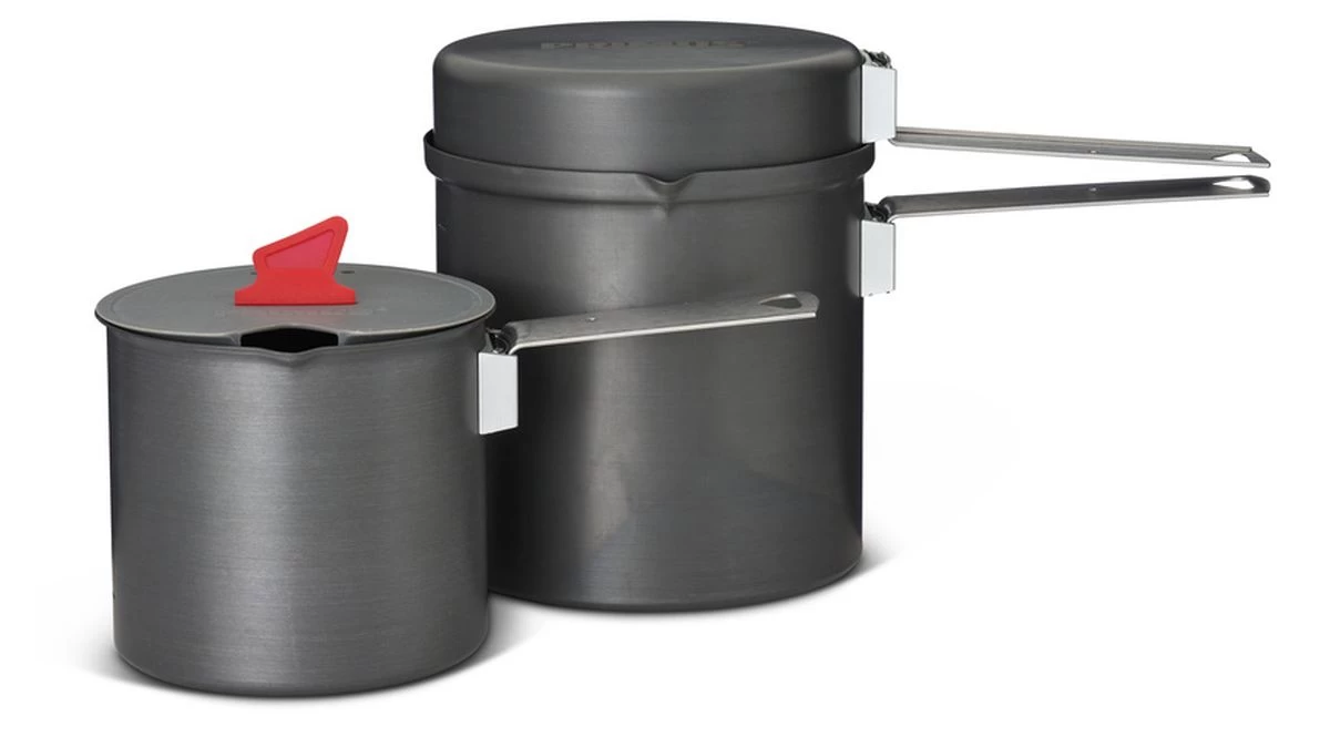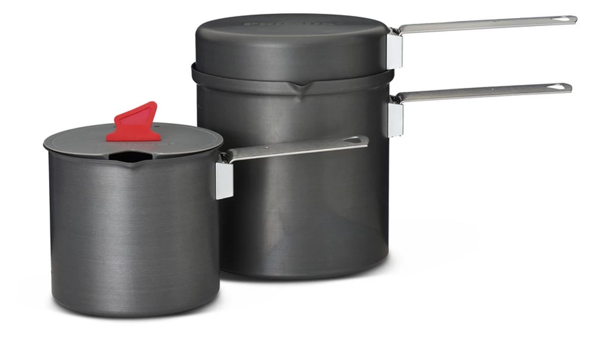 Das Trek Pot Set besteht aus zwei Töpfen mit 0.6 L und 1.0 L Fassungsvermögen und einer Pfanne. Topf und Pfanne sind aus harteloxiertem Aluminium gefertigt und mit einer Antihaft-Beschichtung aus Keramik versehen. Im kleineren Topf haben wir in den Deckel, ein praktisches Sieb aus PP-Kunststoff und einen Silikongriff integriert.