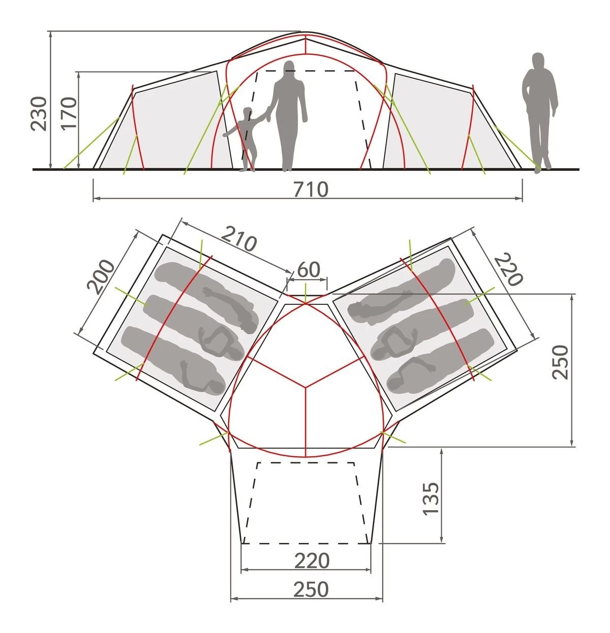 Hier wurde extravagantes Design mit maximaler Funktionalität gepaart: Optimal für alle, die es leid sind, in Querschläferzelten immer „hinten“ schlafen zu müssen. Durch eine Drehung der Innenzelte werden die Schlafräume zu „Längsschläfern“. Das Zelt ist mit einer Wassersäule von 3.000 mm auch bei Dauerregen zuverlässig wasserdicht und bietet ein sehr gutes Raumklima. Ansonsten bietet das windstabile Badawi Long 6P den gleichen Komfort wie sein kleinerer Bruder Badawi 4P: einen großen Innenraum, hervorragende Belüftung durch das VAUDE Top-Vent-System und die Netzfenster, zusätzliche Taschen an den Zelttüren und eine extra Bodenunterlage für den Vorraum. Dank Farbcodierung am Gestänge und den Gestängekanälen ist der Aufbau schnell gemacht. Durch das außenliegende Gestänge können zudem Innen-und Außenzelt bequem in einem Schritt aufgebaut werden.