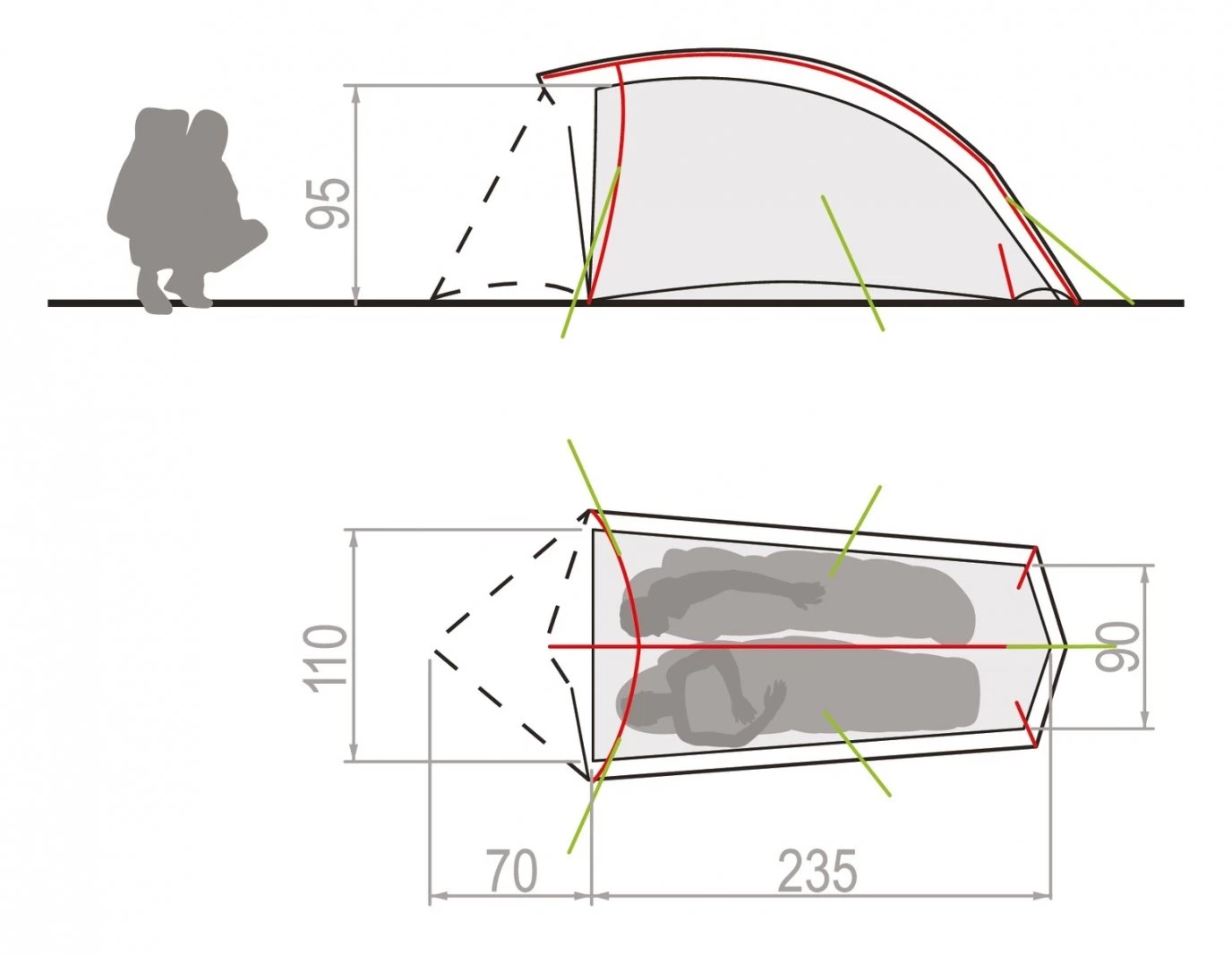 • gekurvter Schnitt am Außen- und Innenzelt für bessere Bodenlüftung